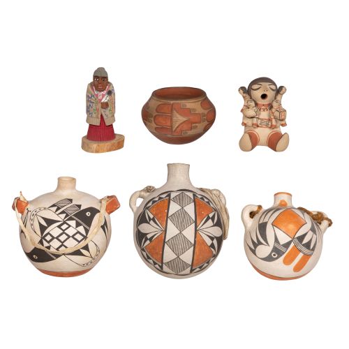 (6) total items including (3) Acoma style jugs and a Santa Ana style jar, all unsigned as well as a Cochita style storyteller figurine illegibly signed on the underside; together with a carved wood Native American figure signed and titled on the underside