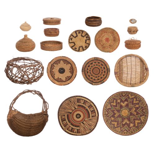 (18) total items including Native American Penobscot curly splint lidded bowl, (2) Tono O'odham (Papago) pine needle and a coil tray, an Akimel O'odham (Pima) coil bowl, a Northwest Coast Nootka or Makah twined basket-covered abalone shell, an Alaskan Yup'ik coiled lidded and a possible Hopi coiled tray; together with other items from Africa and Asia as well as two modern