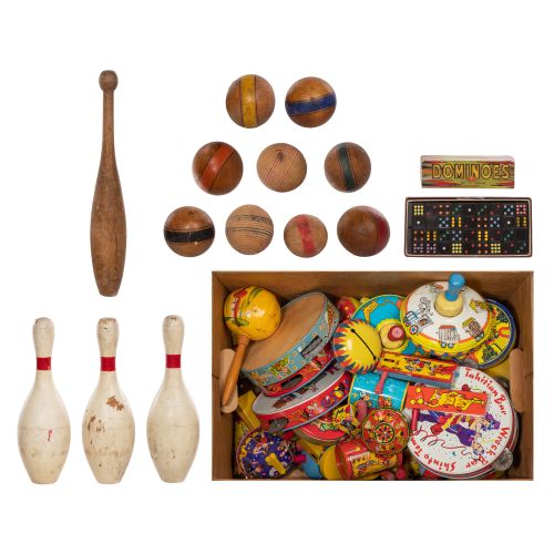 Approximately (65) items, including approximately (50) litho tin items such as tops, tambourines and various types of noise makers, (2) sets of dominoes, (9) croquet balls, (3) bowling pins and an Indian club