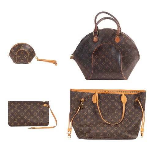 (4) items including an Ellipse handbag, a Mini Ellipse wristlet clutch, a Neverfull tote bag and a Neverfull pochette, all brown monogram canvas having cowhide trim and brass fittings, the Neverfull bag and pochette having fabric lining, all but the Ellipse handbag having leather labels inside
