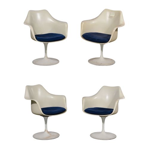 A set of (4) swivel armchairs, molded cream-tone fiberglass seats, set on white-coated aluminum bases stamped, navy fabric upholstered cushions, original Knoll International label