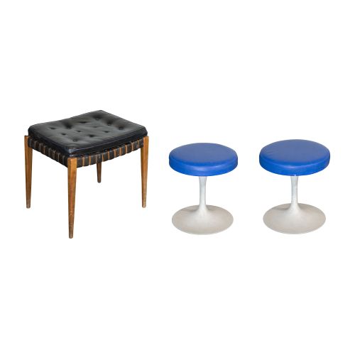 (3) total items including a pair of stools from the Pedestal Collection, having painted metal bases and original blue vinyl seats, retaining original tags; together with a black woven leather ottoman having a tufted cushion
