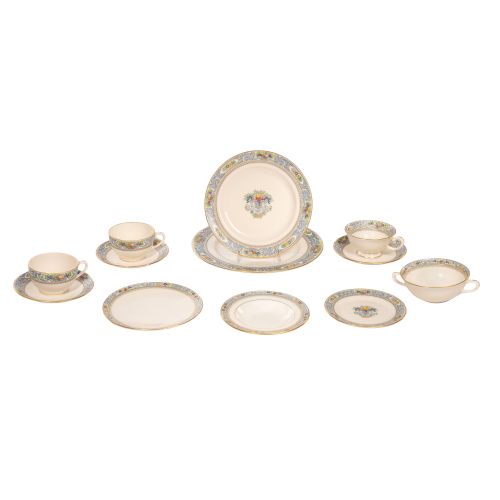 (173) total items including two interchangeable patterns Autumn and Trent together totaling (142) items, in the Autumn pattern having (90) items including (15) 10 3/8-inch dinner plates, (28) 8 3/8-inch salad plates, (14) 5 5/8-inch bread and butter plates, (12) 2 1/4-inch teacups, (2) 2 1/4-inch coffee cups, (16) 5 5/8-inch tea saucers, (1) 8 1/2-inch round bowl, (2) 14 1/2-inch round platters and the Trent pattern having (52) items including (15) 7-inch bread and butter plates, (17) 6 1/2-inch double-handled soup bowls, (18) 6 1/8-inch fruit bowls, (1) 12 1/2-inch round platter, (1) 7 1/2-inch gravy boat and pitcher; together with a gold banded tea party service for (12) made for Marshall Fields and Company as well as English plates and serving pieces