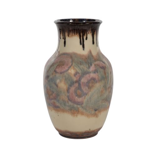 Having a high glaze finish, an abstract floral design on a cream-colored background and a distinctive dark, drippy glaze around the rim, signed by artist and stamped 1928, form 2820, retaining original label
