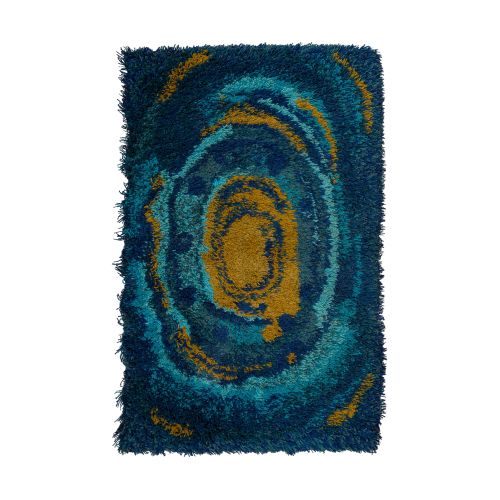 An abstract Scandinavian wool rug having a long pile in hues of blues, greens and golds