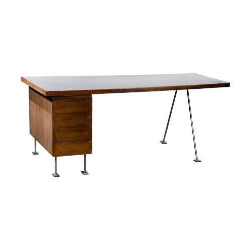 Having a trapezoidal teak-framed gray laminate top supported by stainless tubular trestle legs at the narrower end and by a teak cabinet having stainless feet, four dovetailed drawers on each side (for a total of eight) at the wider end