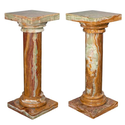 A similar pair, columnar shaped veined green and caramel alabaster, square tops and bases