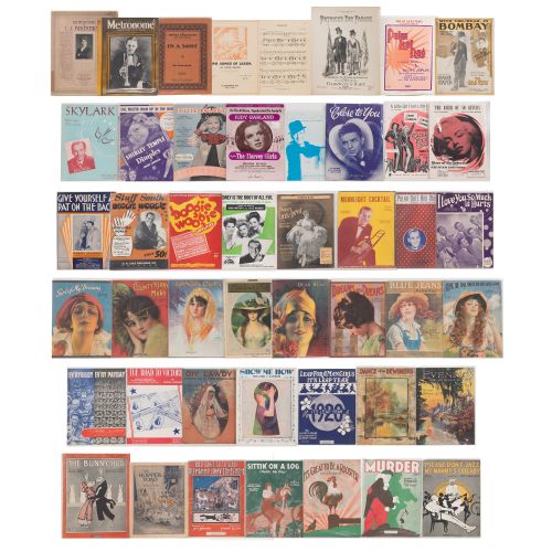 Approximately (2000) items of sheet music, spanning the turn of the 20th century to Stephen Sondheim and novelty, some covers having vibrant lithographic art illustrations, most stored in plastic sleeves; together with Elvis 45 RPM records and music, an Italian music roll and a few pieces of photographic ephemera