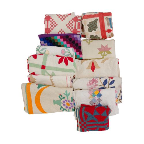 (12) items of various shapes, sizes, eras, colors, patterns and materials, most hand stitched