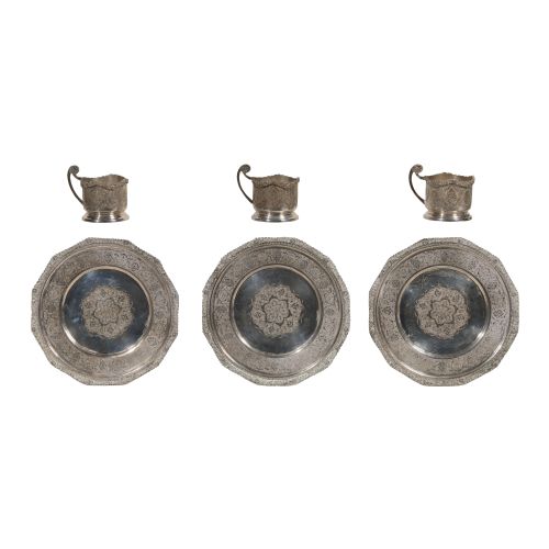 (6) items including (3) cup holders and (3) plates (foreign marks) all engraved