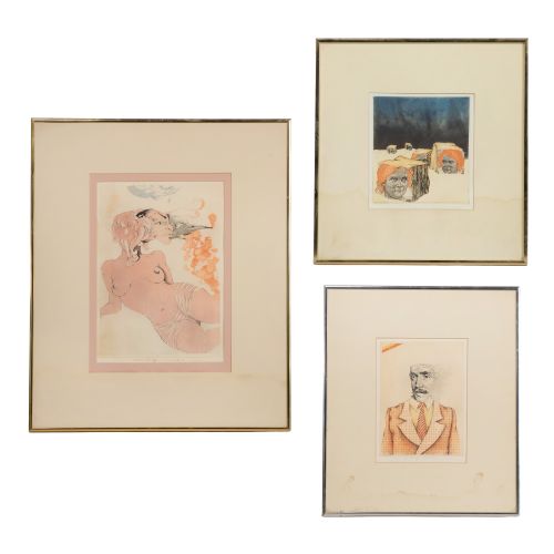 (3) signed items including 1971 "Lysistrata" #91/100, a 1973 "Inventor of the Rainbow" #1/0 and 1973 "Twins" #10/80, all matted under glass in metallic frames