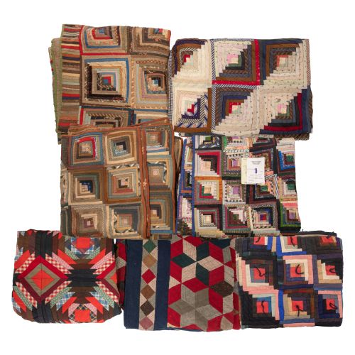(7) hand-stitched items, having multi-color fabric scraps pieced into various geometric patterns, mostly log cabin but including a pineapple variant and tumbling block / star pattern