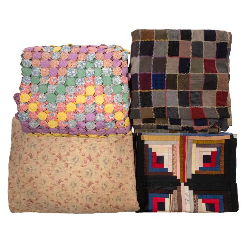 (4) items including a yo-yo coverlet, a log cabin pattern and (2) simple square patchwork