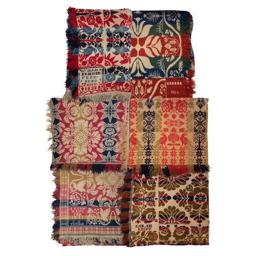 (6) items of various color combinations and patterns including a marked "William Schnee / Freeburg / Penn. / 1838", a marked "Andre Kump / Hanover / 1840 / B. Landis", (2) matching panels not stitched together marked "A. Kump / Hanover / 1841 / C A / Tenner", an undated marked "Sarah Reiff" and an unsigned dated "1854"