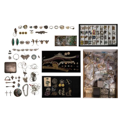 Including chain necklaces, pendants, bracelets, brooches, pins, a cigarette case, earrings and rings (most marked "925"), fashion rhinestone jewelry and approximately (7) pounds of costume jewelry, some having stones