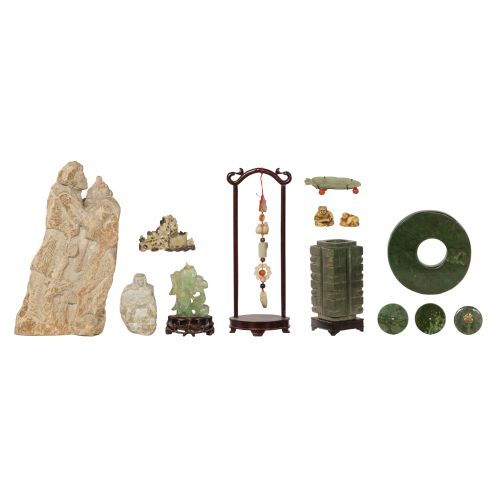 (13) items including hand carved jadeite jade and hardstone figures, bowls, discs, netsukes, a bi, some having stands