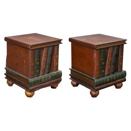 A pair of faux leather textured cloth covered wood cabinets in the form of oversized books having gilt titles to spines, the row of vertical faux spines forming the door to the interiors, unmarked