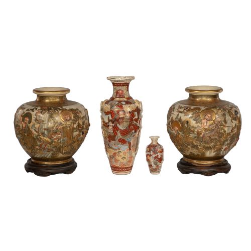 (6) total items including (2) vases and a pair of urns, both in the Satsuma style; together with (2) wood stands