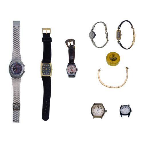 (8) items including an Omega Chronostop ref. #145.009 17-jewel movement, a 1929 Illinois serial #S3977176, 17-jewel movement (case marked "14k") as well as (5) watches including Girard-Perregaux, Timex, Elgin and Bulova, some without bands and a gold tone band