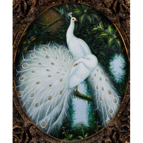 Undated, unsigned, depicting two white peacocks within lush, green foliage, set in an ornate, dark wood frame