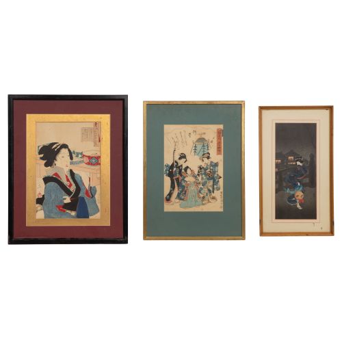 (3) items including "Looking Weighed Down" by Tsukioka Yoshitoshi, "Fifty-four Chapters of the False Genji" by Utagawa Kunisada II and "Cold Winter Wind" by Takahashi Hiroaki, all having artist marks using Japanese lettering, all matted in frames