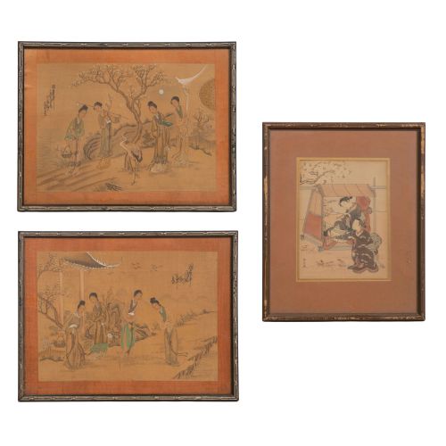 (3) items including a picnic scene by Suzuki Harunobu and (2) untitled prints depicting courtyard scenes, all in wood frames