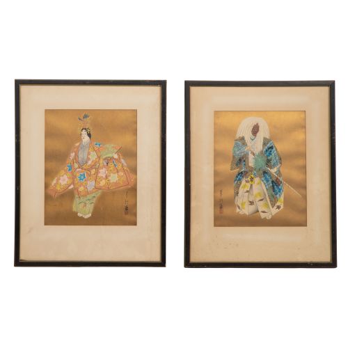 (2) items including "Phoenix" and "Yamauba" on a golden background, both having chop mark, matted under glass in wood frames