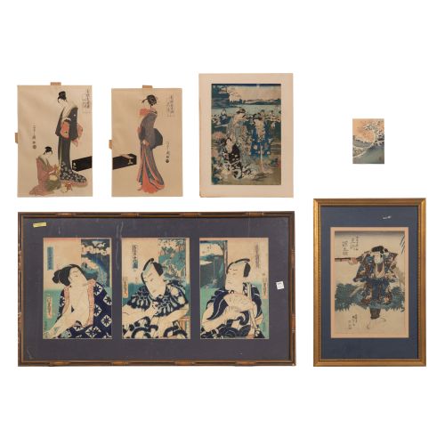 (6) items including (2) prints from Utagawa Kunisada (a triptych having Kabuki actors and a Three Geisha enjoying the beach), (2) Geisha by Chobusai Eishi, The Great Wave by Katsuchika Hoksusai and a Samurai by Kunyoshi, all having chop marks and Japanese writing, two having frames