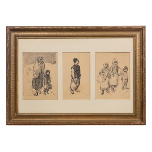 1915, pencil signed, three lithographs presented in a single frame depicting refugees and the impact of war on civilians, matted under glass in wood frame