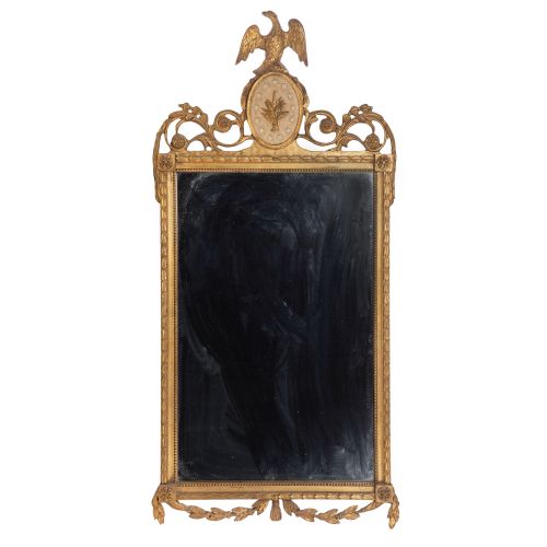 Early 20th century, gold-tone composite on carved wood frame surmounted by an eagle perched on a scroll supported star-spangled cartouche, a paper label of F B Decorative Arts, Inc., New York, verso