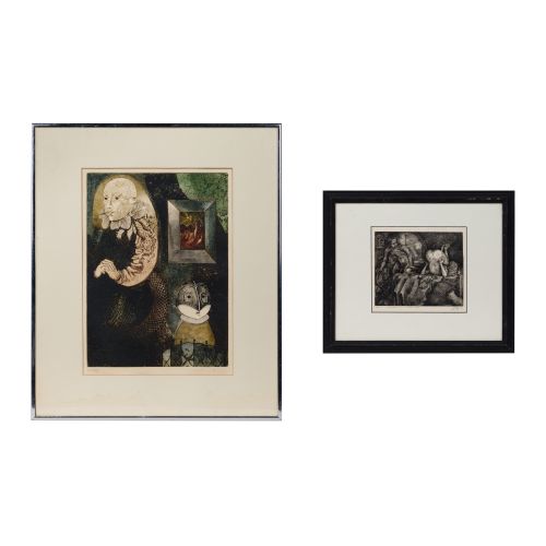 (2) total items including an undated, signed Tarrago etching, #25/300, depicting abstract figures with coloring; together with a 1970 etching initialed "G.M.S.", titled "Tribulations of a Childless Couple" #53/100, both framed and matted under glass