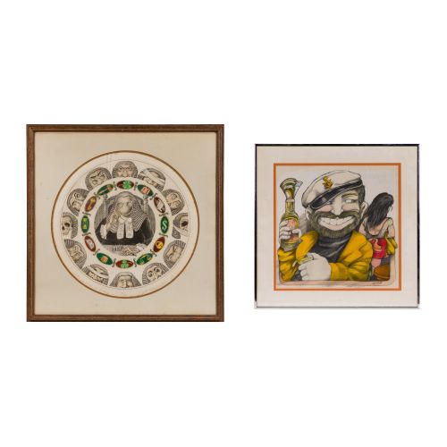 (2) total items including an undated Frankenstein, pencil signed and #50/100, having hand-colored elements, matted behind glass in wood frame; together with an undated, signed "Hy Roth" watercolor depicting a caricatured man with a large beard, sailor's cap and eye-patch, under glass in a metal frame