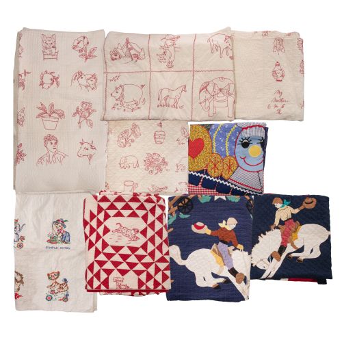(17) items of various colors, patterns and decorative techniques, mostly linear stitched embroidery storybook and animal motifs, some pictorial pieced applique imagery