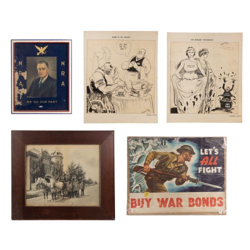 (5) total items including (2) original artwork for political cartoons by Dorman H. Smith (American, 1892-1956) including "Down to the Desert" concerning Mussolini's invasion of Ethiopia and "The Innocent Bystanders" about abuses of African-American troops (inscribed and pencil signed again), both signed ink on paper mounted to illustration board, a 1942 War Bonds poster under plastic on cardboard support, a 1933 NRA (National Recovery Act) poster having a portrait of FDR behind glass in a painted wood frame; together with a large format albumen print of a fire brigade and 2-horse fire engine behind glass in an oak frame