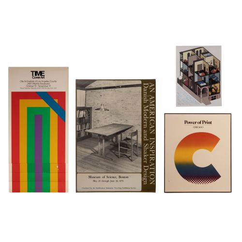 (8) items including (5) undated posters for the exhibition "Time Cover Art" at the Otis Art Institute of Los Angeles County in the style of Howard Mehring (American, 1931-1978), a "Power of Print / Chicago" poster mounted to board, a Museum of Science, Boston poster for a 1976 exhibition on Danish Modern and Shaker furniture and a Chris Ware poster for an exhibition at The Hubris Public Gallery, New York, New York, all unframed