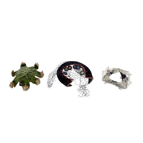 (3) items including a triangle hat having three white beaded butterflies, a horseshoe form having white and red beads, netting and various miniature albums and a round leaf hat having enamel and ceramic turtles on ends, all retaining original cloth labels