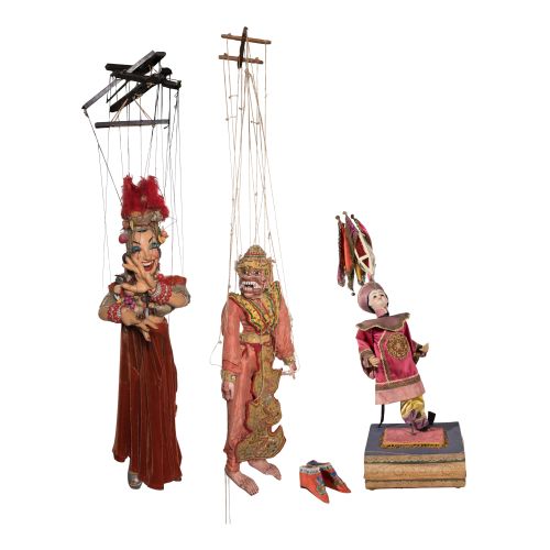 (4) total items including a European chinoiserie automaton depicting a juggler balancing an object having bell-tipped silk streamers on his forehead, a porcelain head and glass eyes, standing upon a silk covered stand; together with (2) marionettes including an Asian Hindu deity, Hanuman and a Latin American style female samba dancer as well as a pair of small Chinese embroidered shoes