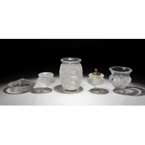 (5) items including a Dampierre vase, a Bagatelle vase and a Tete de Lion lighter, cigarette holder and ashtray, all having engraved marks underside