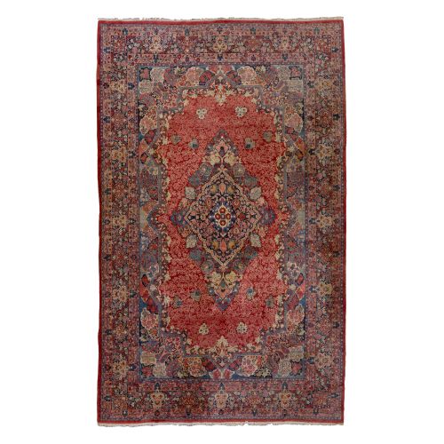 Palatial size, hand woven in a floral design having a center medallion in hues of blue, cream, gold, green and tan on a red / rust field