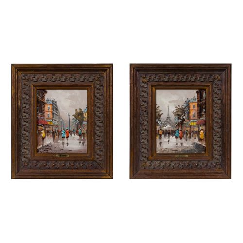 (2) undated, unsigned items, depicting Parisian street scenes, in copper painted frames having artist name placards, biography on back