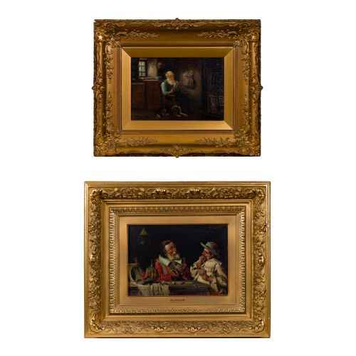 (2) total items including an undated, signed oil depicting two men playing cards, under glass in a painted gold-tone wood frame; together with a 1917 oil on canvas signed "D. Davis" depicting a bearded man reading the paper with his dog in a gold-tone painted wood frame