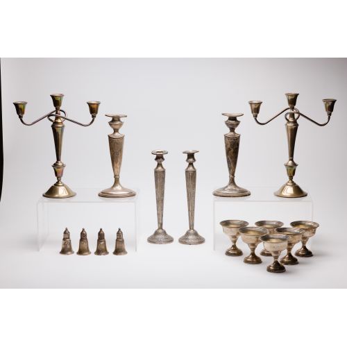 (14) items including a pair of candelabra, (2) pairs of candlesticks, a set of (6) champagne glasses and a set of (2) pairs of salt and pepper shakers (all marked "sterling")