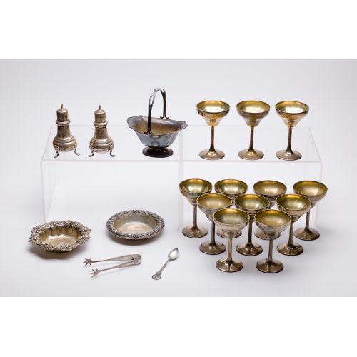 (17) total items including a set of (12) gold washed champagne glasses, a set of salt and pepper shakers, a basket, (2) round trinket trays and a pair of tongs (all marked "sterling"); together with a 0.830 spoon