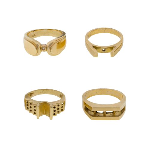 (4) items including (2) having space for a single gemstone and (1) having space for a single gemstone and stepped side for eighteen round cut gemstones (marked "14k" / "585") as well as (1) having space for a bar gemstone (unmarked "10k")