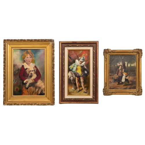 (3) total items including an undated Barrington portrait of a girl and her dog, signed; together with an undated, signed "C. Pierrot" depiction of two children and a dog walking through woods and an undated, indistinctly signed depiction of a troubadour and hound, all in gold-tone gesso on wood frames