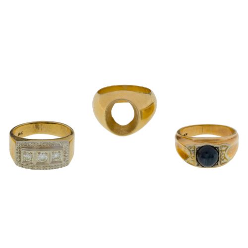 (3) items including a star sapphire ring, a bar style ring having three round cut diamonds and a ring setting (most marked "14k")