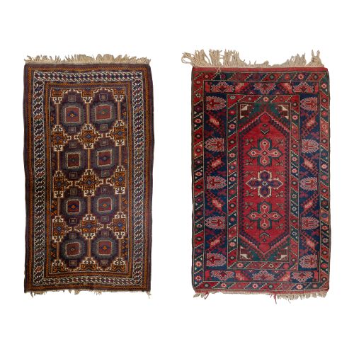 (2) items including a geometrical design in hues of orange, blue, black and cream on a multi-color field as well as a geometrical and floral design in hues of blue, cream and black on a red field (4 ft. 4 in. x 3 ft. 10.75 in.)