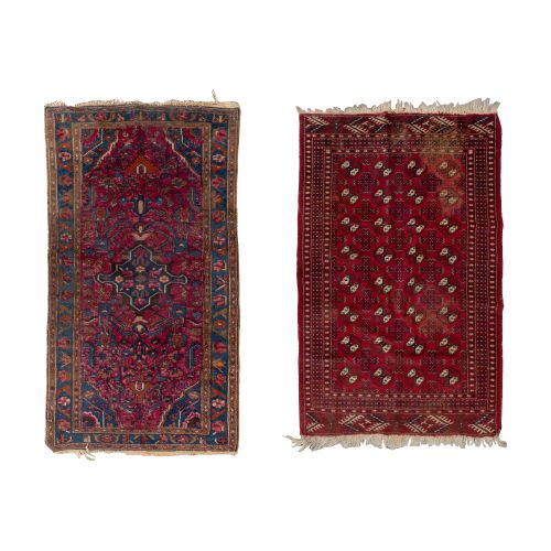 (2) items including a geometric and floral design in hues of blue, cream, gold and brown on a burgundy field as well as a geometric design in hues of cream and black on a red field (5 ft. 7 in. x 3 ft. 7 in.)