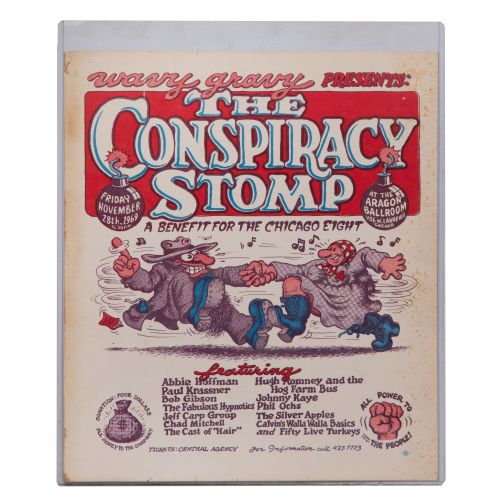 1969, announcing a concert at the Aragon Ballroom to benefit The Chicago Eight, donation required to attend the party was four dollars, with "all money to the conspiracy", unframed in a heavy plastic sleeve