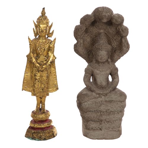 (2) total items including a stone figure of the Buddha Muchalinda, depicting the Buddha seated in meditation on the coiled body of a seven-headed serpent king, who forms a protective canopy overhead; together with a gilded standing Buddha